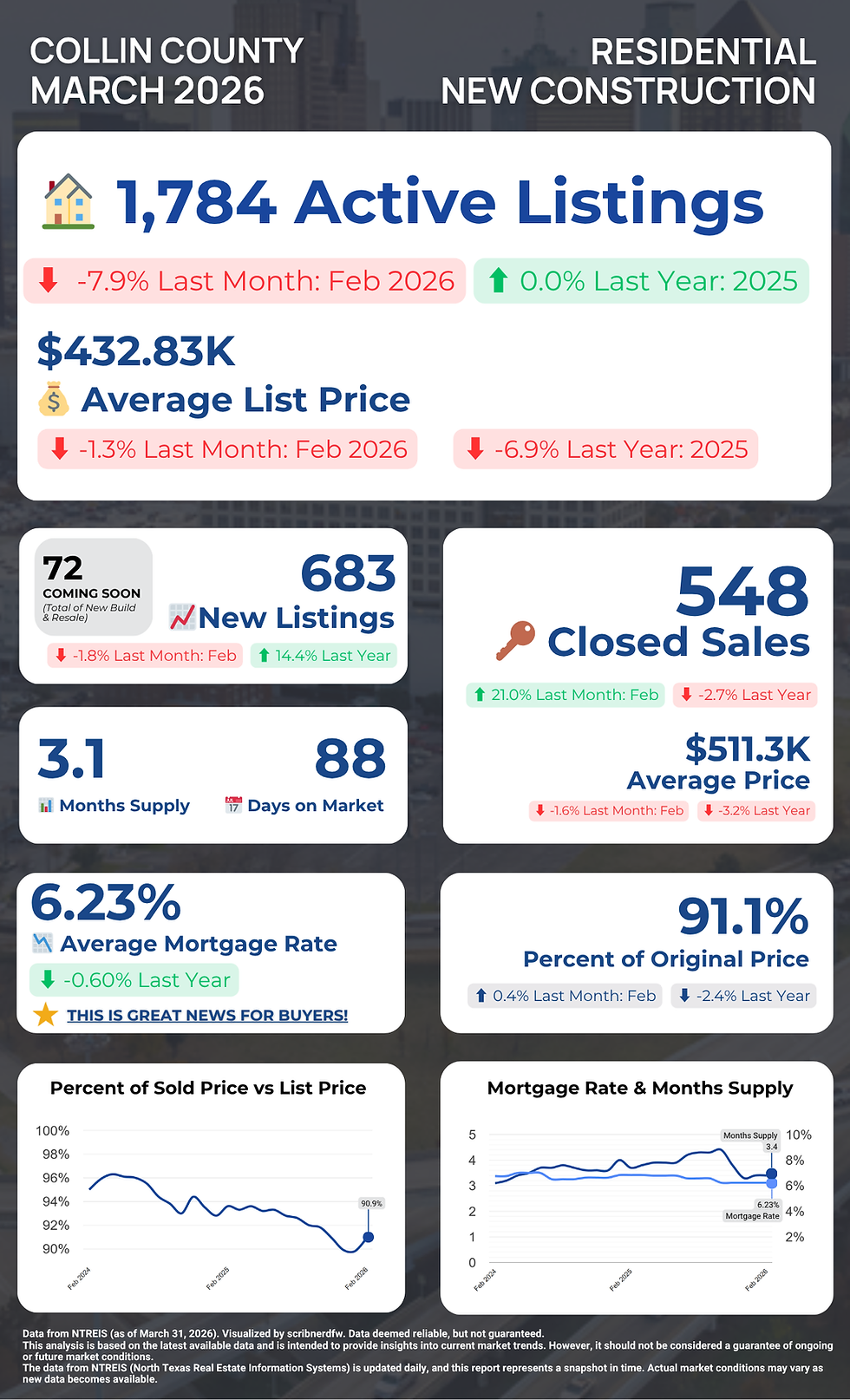 The March 2026 numbers from NTREIS are in, and Collin County is showing one of the most interesting setups we've seen in a while. Mortgage rates held steady at 6.23% — down 0.60% from this time last year — and the report is calling it out plainly: This is great news for buyers.